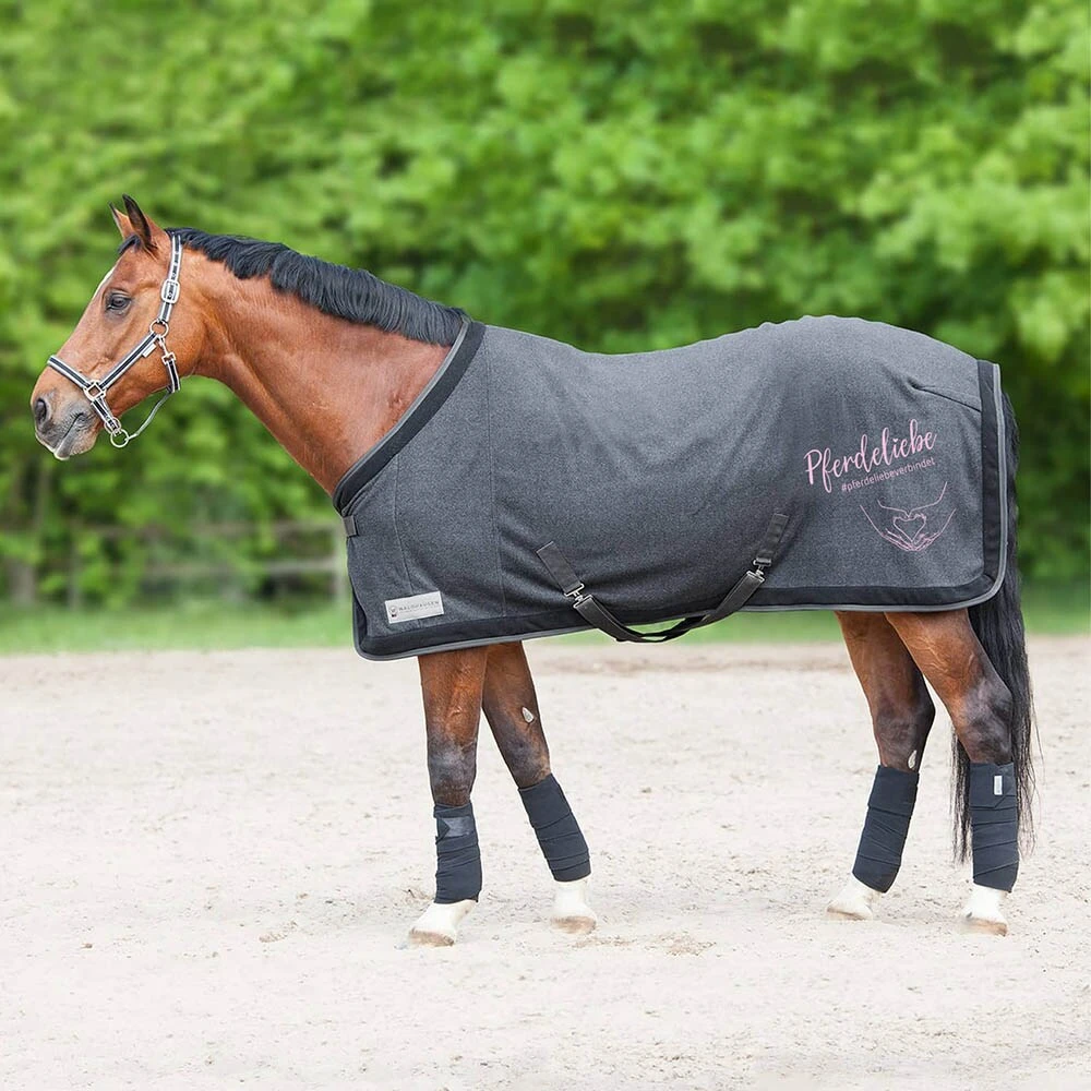 Egal, ob beim Training daheim, im Gelände oder auf dem Turnierplatz: Die Tierarzt24 Abschwitzdecke „Pferdeliebe“ ist überall ein echter Hingucker! Das Material dieser hochwertigen Fleecedecke ist extra weich und bietet die perfekte Abschwitzfunktion. Der Frontverschluss wird durch eine zusätzliche Klettabdeckung geschützt, die Schweifkordel und die abnehmbaren Kreuzgurte (ebenfalls Klettverschlüsse) sorgen für den perfekten Halt.
