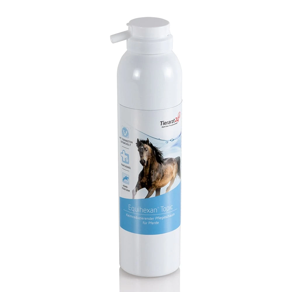 Das Schaumspray Equihexan Topic enthält keimreduzierende Komponenten und einen wertvollen Pflegekomplex aus Aloe vera und Panthenol, der die Selbstheilung der Haut unterstützt. Gleichzeitig lösen die reinigenden Komponenten Verkrustungen und Wundbeläge. Es ist bekannt, dass saubere Wundoberflächen und Wundränder Voraussetzung für eine gute Wundheilung sind. Equihexan Topic wurde speziell für Pferde entwickelt und sollte in keiner Stallapotheke fehlen!